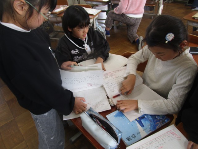 国語科「モチモチの木」では、豆太について考えたことを友だちと伝え合いました。そして、友だちの意見を「にている」「ちがう」「新しい考え」に分類することで、考えを広げたり、深めたりすることができました。