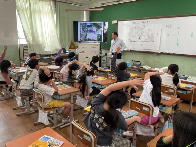 社会科の「わたしたちのまち」では、自分たちの校区の様子について学んでいきます。今回は、先生たちの住んでいる地域についての紹介を聞き、自分たちの校区の様子を紹介するイメージをもったり、方位について体を動かしながら覚えたりしました。これから、校区に出て、校区の様子について探っていきます。