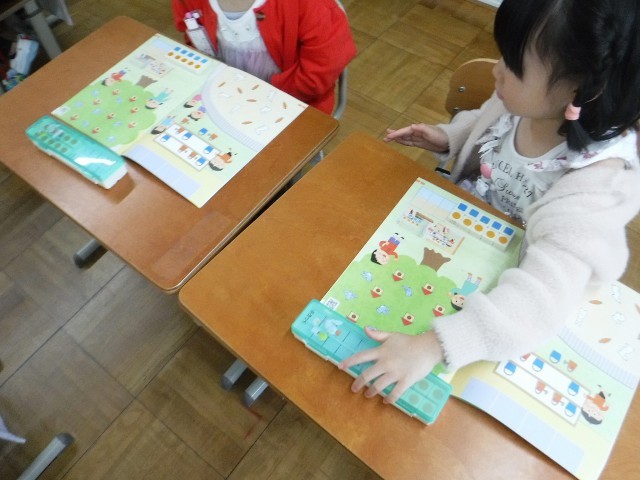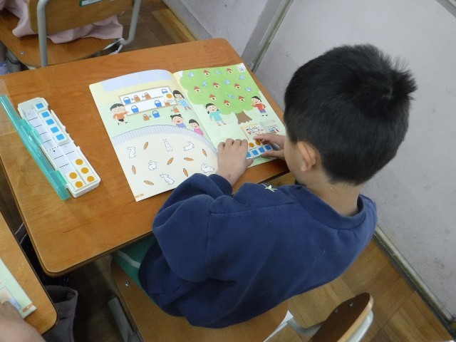 算数科の時間には、数図ブロックを使った学習も始まりました。今日は、挿絵の中にある物の数を正確に数えるために、ブロックを置いて確かめたり、置いたブロックを2列に並べかえて数を比べたりしました。