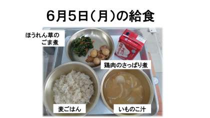 麦ごはん・牛乳・鶏肉のさっぱり煮・ほうれん草のごま煮・いものこ汁です。