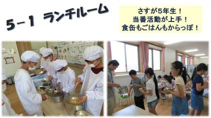 プリプリのうずら卵が大人気のさっぱり煮,ごまの風味豊かなほうれん草のごま煮,具だくさんのいものこ汁,ランチルームに来た5年1組のみんなもぺろりと完食!