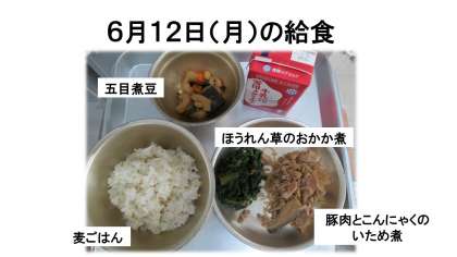 麦ごはん・牛乳・豚肉とこんにゃくのいため煮・ほうれん草のおかか煮・五目煮豆です。