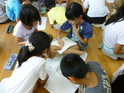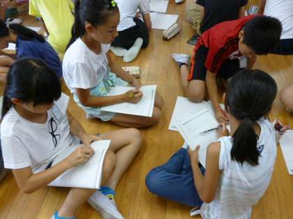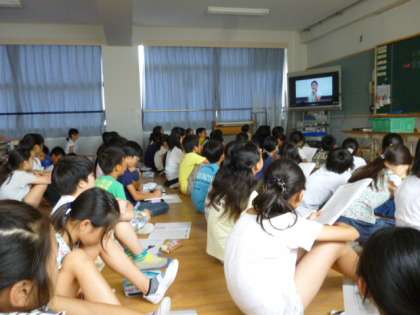 「わたしと仕事」の学習で「働く」ことについて考えを広げるために,インタビュー活動やスチューデントシティで職業体験をします。学年合同で,インタビューの仕方を確認したり,スチューデントシティでの活動を映像で見たりしました。