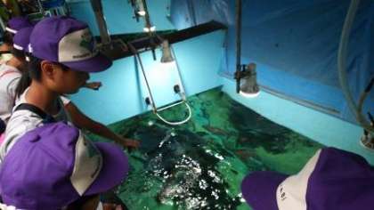 その後,ドチザメやカンパチなど50種類の魚が泳ぐ水槽の上から餌をあげさせていただきました。