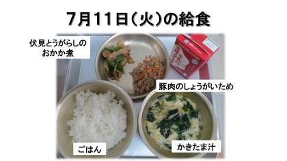 ごはん・牛乳・豚肉のしょうがいため・伏見とうがらしのおかか煮・かきたま汁です。