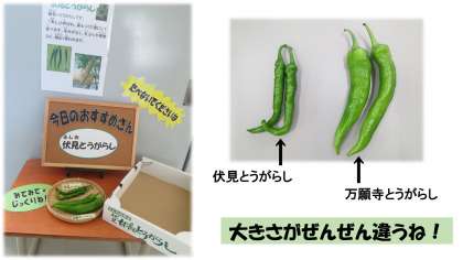 「伏見とうがらしと万願寺とうがらしって何が違うの?」という子どもの問いに,展示された実物を見比べて「大きさが違う!」「太さが全然違う!」と大発見!