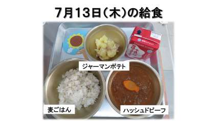 麦ごはん・牛乳・ハッシュドビーフ・ジャーマンポテトです。