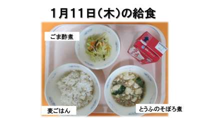 麦ごはん・牛乳・とうふのそぼろ煮・ごま酢煮です。