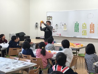 八朔やキウイの豆知識を知ったり,八朔用のカッターの使い方を見たりして,子どもたちは終始「えぇ〜!?」「すごい!!」と言っていました。