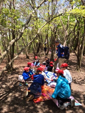 天狗杉山頂でお昼ご飯のお弁当をグループでいただきます。
