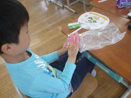 今週,3年生では図画工作「ふんわりふわふわ」の学習で,ビニール袋に絵を描いたり,飾りをつけたりして,風にのせてふんわりふわふわ飛ばしました。