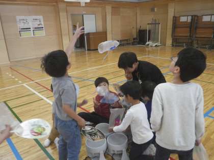 体育館で作品を飛ばしながら,さらに高く飛ばすにはどうしたらよいか,試行錯誤をくり返す子もいました。