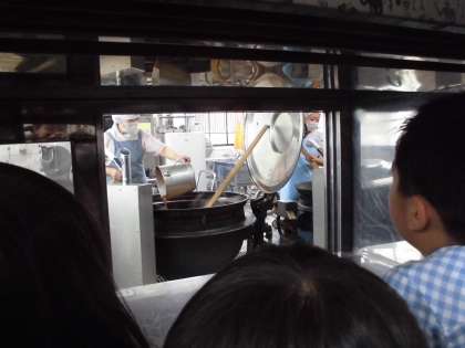 調理の際に使用する大きなザルやしゃもじ,泡だて器などをさわらせてもらいました。サービスホールから給食室を見ると,大きなかまで,今日の給食の「肉みそいため」「切干大根の煮つけ」をつくっているところでした。