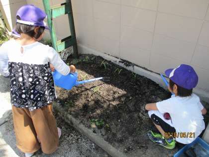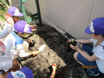 1年生は初めての植え替えなので,少し緊張した様子でしたが,3・4年生のお兄さんお姉さんが優しく教えてくれたので,上手に植えることができました。植えた後は,みんなでたっぷりと水やりをしました。