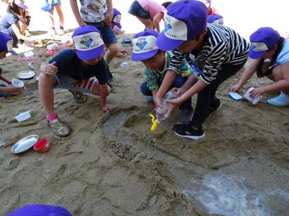 21日(月)の図画工作科の学習は,砂場で行いました。砂や土にさわって,からだ全体で造形遊びをしました。
