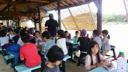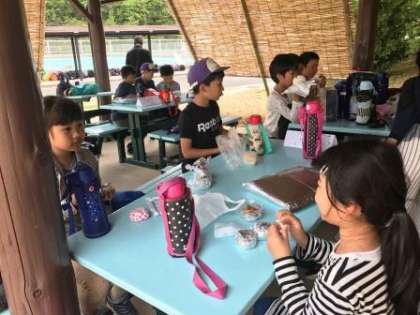 おうちの方に作っていただいたお弁当を「あずまや」でおいしくいただきました。エネルギーをしっかりと蓄えることができました。
