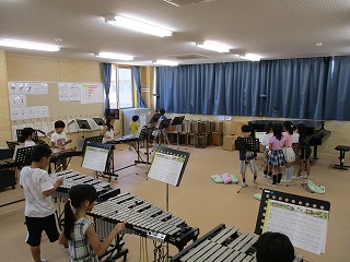 音楽の時間に,1・2組合同で,教室と音楽室に分かれて合唱・合奏の練習をしました。教室グループは,「かっこう」の鍵盤ハーモニカ奏や「かえるのうた」などの歌,リズム,動物の鳴き声の練習,音楽室グループは,「アイアイ」の木琴や鉄琴など,合奏の練習をしました。