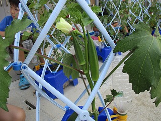 「オクラの花が咲いてる!黄色くてきれい!オクラの実がすごく大きい!」