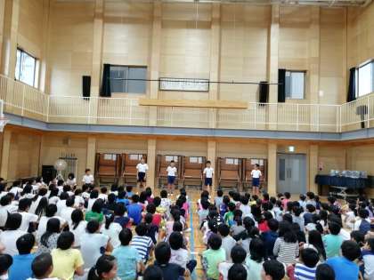 本日,児童朝会を行いました。その際に各色応援団長からスローガンの発表がありました。どの色も,このスローガンのもと,全力でスポーツフェスティバルを盛り上げてほしいです。