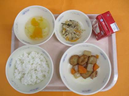 今日の給食は「ごはん・牛乳・平天とこんにゃくの煮つけ・切り干し大根の三杯酢・フルーツ寒天」でした。1年生にとって初めてのフルーツ寒天でした。「固まってきた」「プルプルしてておいしそう」「甘くておいしい」「すごい」と冷めて固まる寒天に驚きと感動がいっぱいの様子でした。