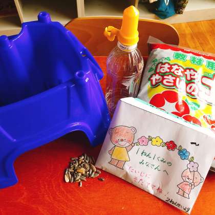 1年生は,2年生からもらったお花の種を育てるのに,水や太陽,植木鉢や土が必要だと考えました。そこで,必要なものを用意しました。
