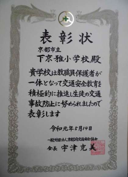 保護者のみなさまや地域のみなさまが学校と一体となって交通安全教育に取り組んでいるということで「京都府交通安全協会」より表彰状をいただきました。