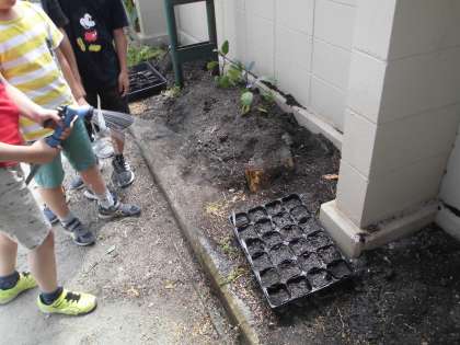 休み時間に集まり,ミニトマトとナスの苗を植え,ヒマワリ,オジギソウ,ホウセンカなどの種をまきました。