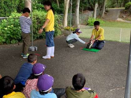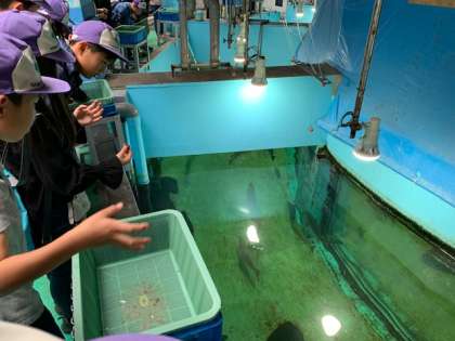 志摩マリンランドでは,「ペンギンタッチ」と「餌やり」の2つのグループに分かれて体験しました。ペンギンを触った感触は,予想外のサラサラに驚いていました。水族館の裏側に入って水槽の上から泳いでいる魚に餌をあげる貴重な経験もしました。