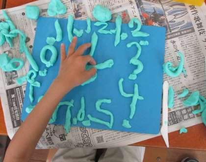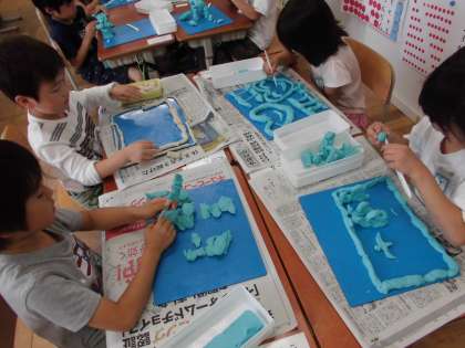 図画工作科の学習でねんどを使いました。ねんどをちぎって丸めてねんど体操!箱の形,三角の形,丸い形…いろいろな形をつくりました。ねんどを手のひらで転がすと…ながーいながいひもになりました。このひもひもねんどを使って,いろいろな形をつくりました。にじをつくったり,かたつむりをつくったり,へびをつくったり…いろいろな形をつくることを楽しんでいました。
