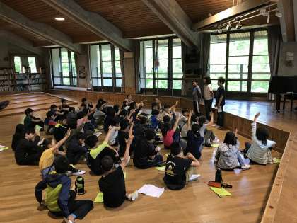 プレイホールで朝のつどいを行いました。係の人が山の家に関するクイズをして,朝から楽しく目を覚ますことができました。