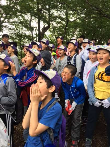 みんなで山の家に向かって「ヤッホー」と叫びました。山の家からも「ヤッホー」と声が返ってきました。聞こえると歓声がわきました。