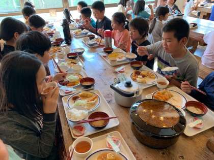 食堂での夕食は、バイキングスタイルなので、みんな好きなものを好きなだけ食べています。