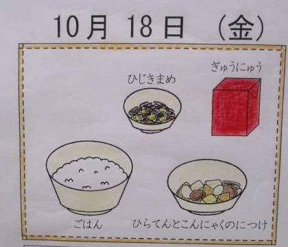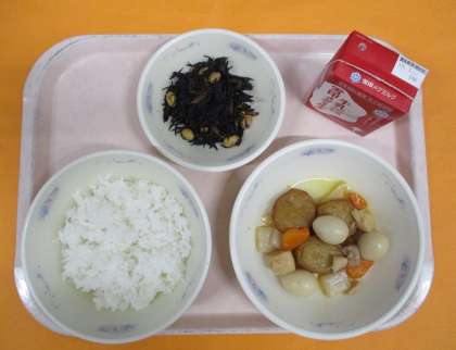 今日の献立は「ごはん・牛乳・平天とこんにゃくの煮つけ・ひじき豆」でした。平天とこんにゃくの煮つけの平天が人気で,おかわりをしている姿がたくさん見られました。「平天大好き」「まだまだ食べられる」とおいしく給食をいただきました。