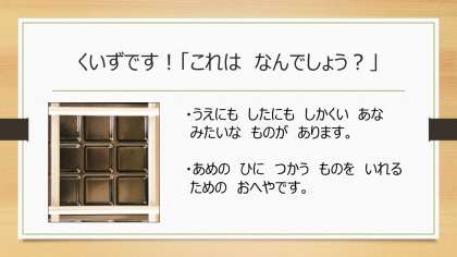 がっこうに あるものの くいずです! みなさんが がっこうに きたら,みたり つかったり するものです。