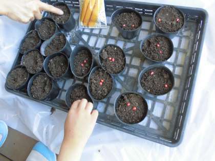 とうもろこしの たねを うえてみました。 まいにち みずを あげて います。 がっこうがはじまったらみんなで みずやりをして, おおきくなったら はたけに うえかえたいと おもっています。 どんな はっぱが でてくるか たのしみですね。