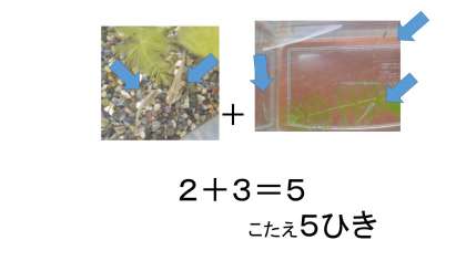 つぎは, まえにだした メダカの クイズの こたえです。 おおきな メダカが 2ひき, ちいさな メダカが 3びきで, 2+3=5 5ひきが せいかいです。