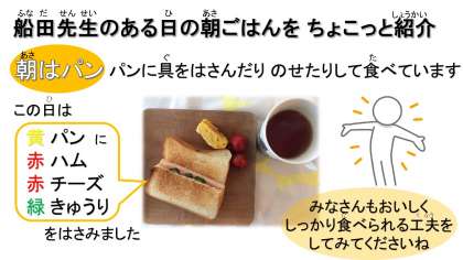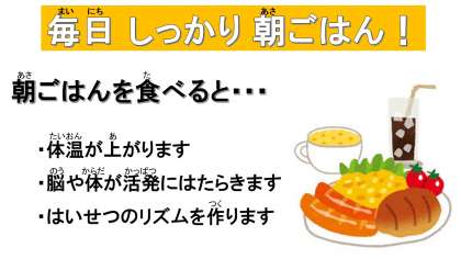しっかり朝ごはんを食べて,元気いっぱいのみなさんに会えるのを楽しみに待っています!