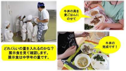 ごはんの上に自分で具をのせ牛丼の完成,みんな笑顔でおいしそうに食べていました。