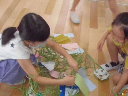 1・2年生が笹飾りを作って笹につける活動をしていました。