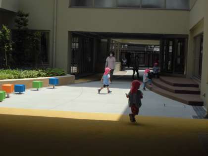 1学期には,ピンク色の帽子をかぶった2歳児までのお友達が,時々校内をお散歩していました。