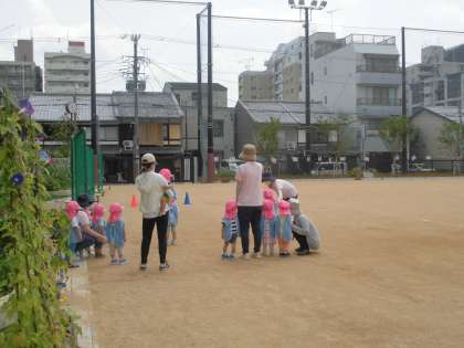 夏休み期間中,運動場開放を行っている時間帯にも「ゆりかごWECせいせん保育園」のお友達が運動場に遊びに来ていることもあります。