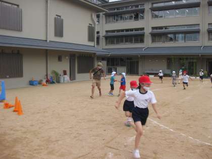 ちょうど中間休みだったので,楊梅幼稚園のお友達と遊びたかった1年生にはチャンスでした。楊梅幼稚園のすみれ組さんと1年生が遊び始めました。先生も交じっておにごっこをしてとても楽しそうでした。