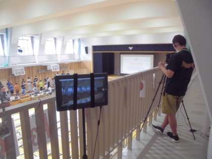 会場の密を避けるために,舞台も客席も広く取っています。アリーナで観賞できるのは一つの学年だけです。他の学年の鑑賞は,アリーナと教室のテレビとをつないでのライブ放送で行います。アリーナの上からみんなの姿を撮影しています。