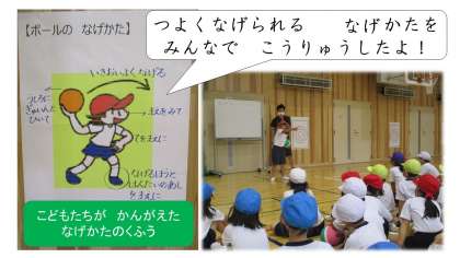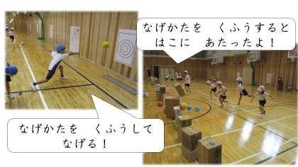 1年「ボール遊び」では,ボールを強く投げる投げ方を,活動しながら考えていきました。「なげるときに かたあしを まえにだす」「いきおいを つける」「うしろに かたを ひく」など,様々な投げる工夫を交流することができました。