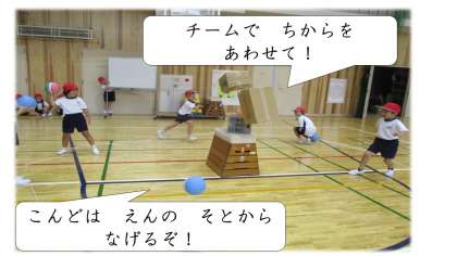 その「投げる工夫」を生かして,的に当てたり,箱に当てたりと,めがけて投げる活動をしました。「当たった〜!」「やった〜!」と,あちらこちらで喜びの声が聞こえます。けれど,「とおくから なげるのは むずかしいなぁ。」「もっと はやく なげられたらなぁ。」など,もっとこうしたい!という想いも溢れています。