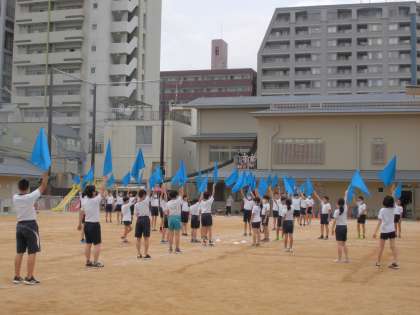 運動場で練習していると,楊梅幼稚園の園児さん達が手をとめて6年生の演技に見入っていました。園児さん達の熱いまなざしを受けて,6年生の演技にも熱が入りました。