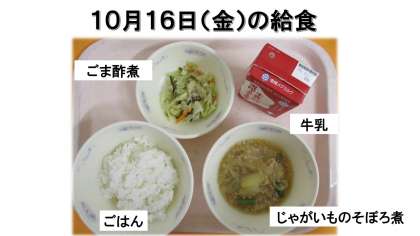 ごはん・牛乳・じゃがいものそぼろ煮・ごま酢煮です。