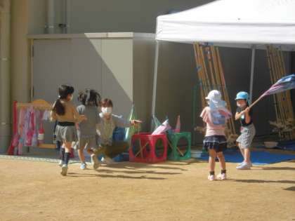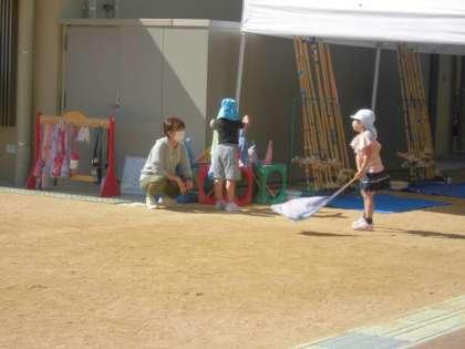 ちょうど,グラウンドで楊梅幼稚園のお友達と一緒にいる姿を見つけると靴を履き替え,向かっていきました。