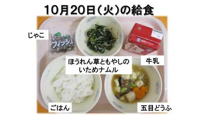 ごはん・牛乳・五目どうふ・ほうれん草ともやしのいためナムル・じゃこです。