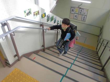 2階にある放課後まなび教室の部屋に向かう1年生が「右側通行,右側通行」と言いながら階段を上がってきました。